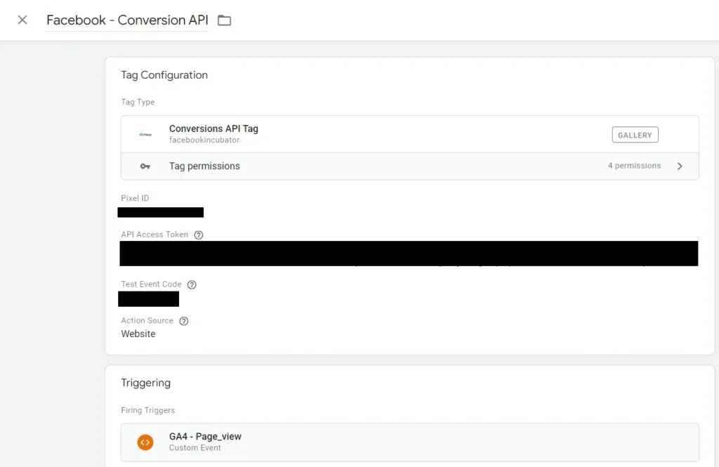 You can find the tag type “Conversions API Tag” in the GTM templates gallery. The Pixel ID, API Access Token and Test Event Code can be found in Meta’s Events Manager as shown below.