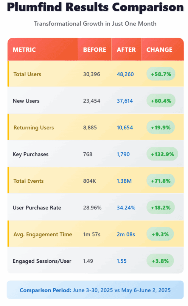 Plumfind implemented advanced analytics optimization that enhanced user tracking accuracy, improved conversion attribution, and provided deeper insights into customer behavior patterns.